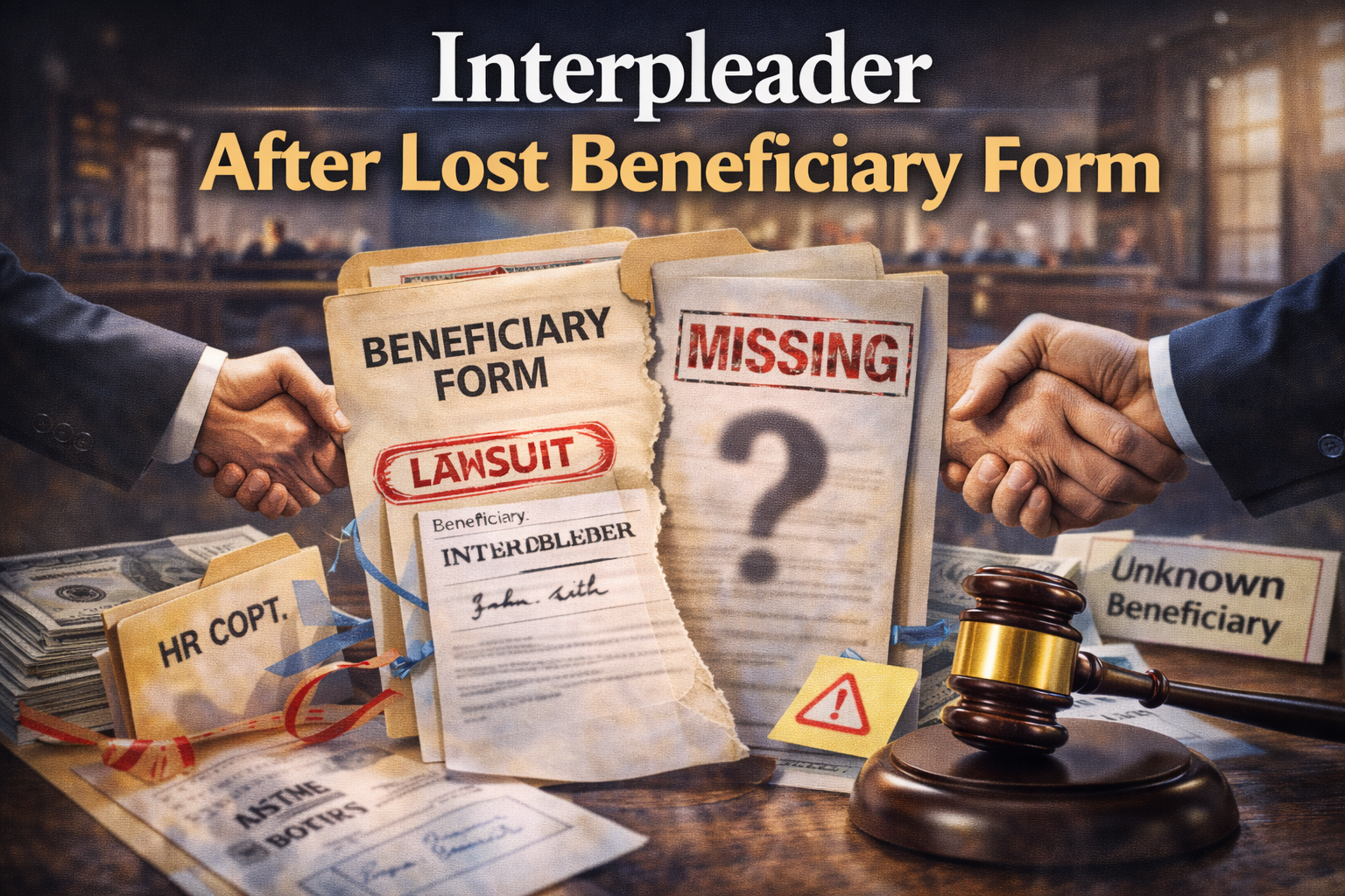 Interpleaders are a shield for insurers. When they lose a beneficiary form, they face two risks. They may pay the wrong person, or they may be sued for negligence. Filing an interpleader eliminates both risks. The insurer deposits the money with the court and walks away. The beneficiaries must then fight each other to prove who should be paid.